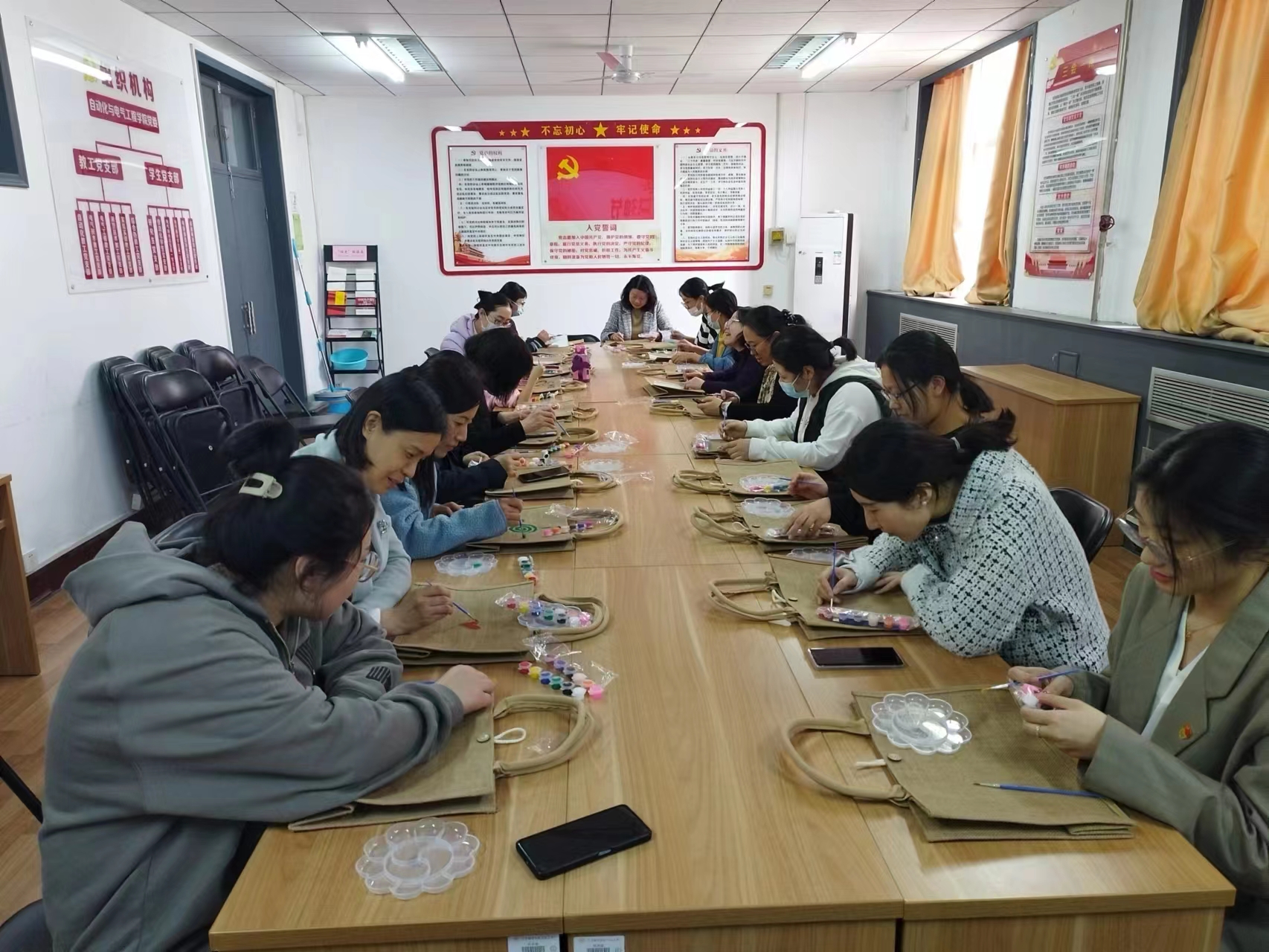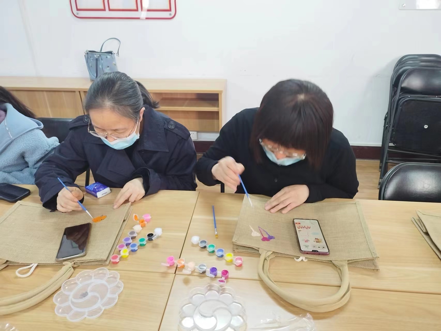 教院为女教工筹办了脚画包的本质料。举动中,年夜家充溢发扬本身的设想力,构想、定型、调色,勾画线条,正在麻