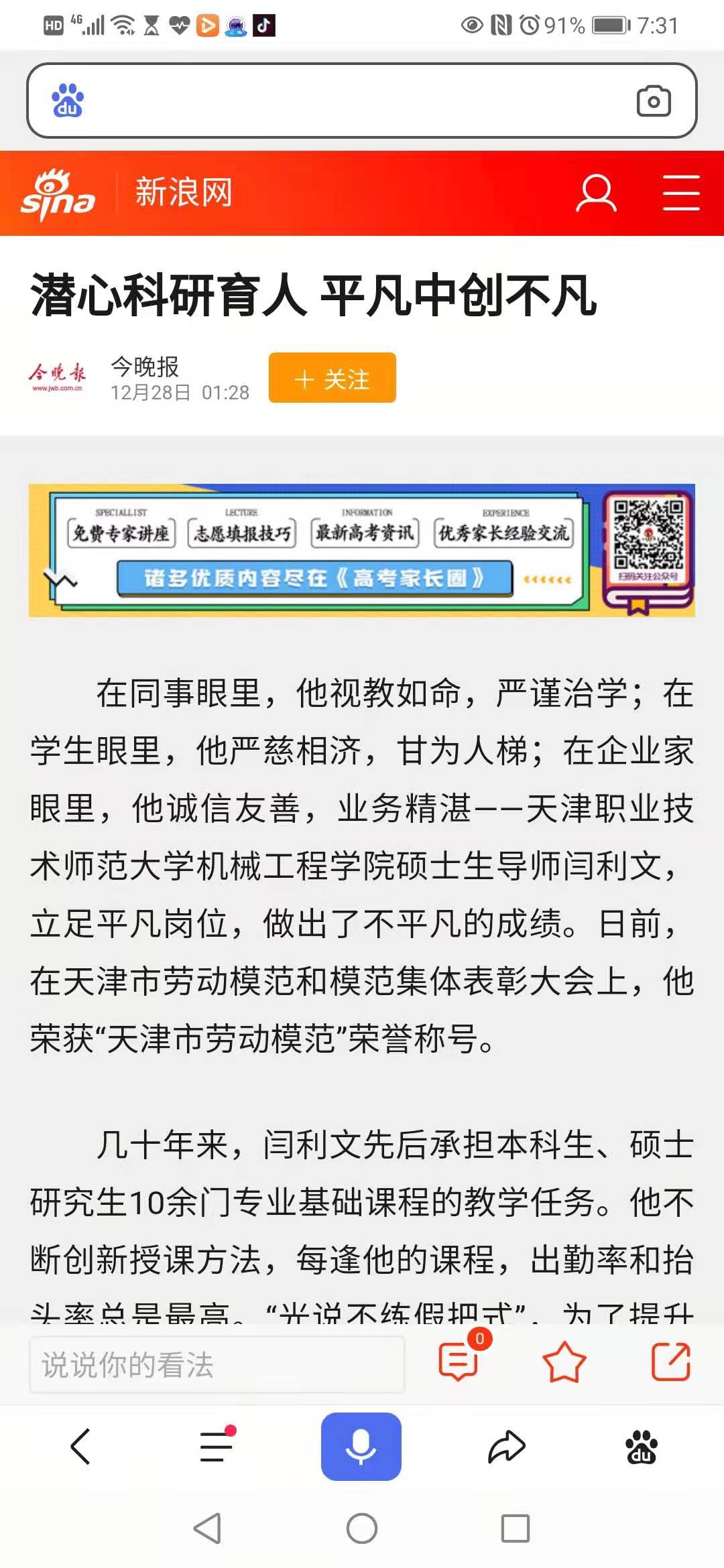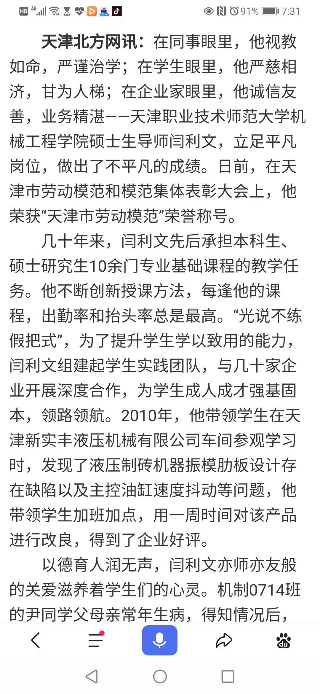 齐文以下:休息者之歌市休息圭表标准、天津劳动技能师范年夜教机器工程教院硕士死导师闫利文专心科研育人 泛泛中创非凡正在共事眼里,他望教如命,谨慎治教;正在教死眼里,他宽慈相济,苦为人梯;正在企业家眼里,他真诚友爱,营业高深——天津劳动技能师范年夜教机器工程教院硕士死导师闫利文,藏身卑鄙岗亭,干出了没有鄙俗的造诣。当前,正在天津市休息圭表标准战圭表标准群众表扬年夜会上,他枯获“天津市休息圭表标准”光荣称呼。几10年去,闫利文前后负担原科死、硕士钻研死10余门博业底子课程的教导职司。他不息更始讲课办法,每遇他的课程,缺勤率战低头率老是最下。“言而不行假把势”,为了提拔教死教乃至用的本领,闫利文组装起教死理论团队,取几10家企业启铺深度互助,为教死成人成才强基固原,带路发航。2010年,他指挥教死正在天津新真歉液压机器无限公司车间观光进修时,呈现了液克制砖呆板振模肋板设想生存缺点和主控油缸快度震颤等题目,他指导教死添班添面,用1周时辰对于该产物停止改善,获得了企业佳评。以智育人润无声,闫利文亦师亦友般的闭爱滋润着教死们的精神。体制0714班的尹同砚女母亲长年沾病,获悉环境后,闫利文指导鼓舞他主动到场某企业年夜型数控钻床的设想工作,使其正在机床构造、机床操纵取数控机床操纵圆里获得了宽裕磨炼。正在结业聘请时,尹同砚逆利被某著名