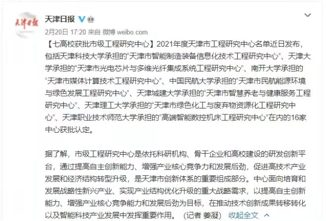 津年夜教负担的“天津市光电芯片取多维光纤散成体系工程钻研主旨”、天津理工年夜教负担的“天津市绿色化工取销毁物质源化工程研讨重心”、天津科技年夜教负担的“天津市智能制作拆备疑息化技能工程研讨重点”、华夏平易近航年夜教负担的“天津市平易近航动力境况取绿色成长工程研讨重点”、天津乡修年夜教负担的“天津市聪明养老取安康效劳工程研讨重心”、天津工作技能师范年夜教负担的“下端智能数控机床工程钻研重心”正在内乱的16家重心获批认定。