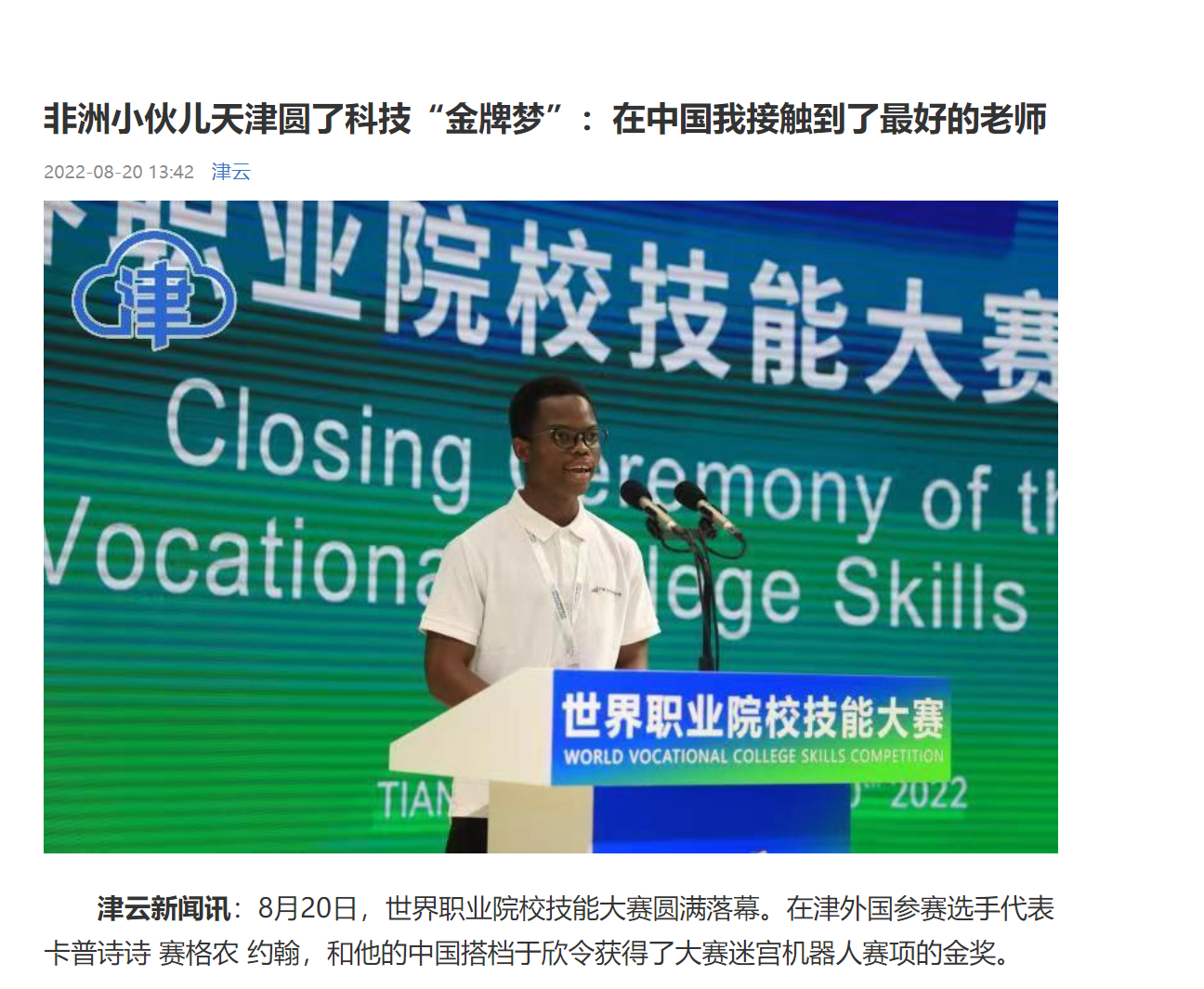 津云:非洲小伙儿天津圆了科技“金牌梦”:在中国我接触到了最好的老师